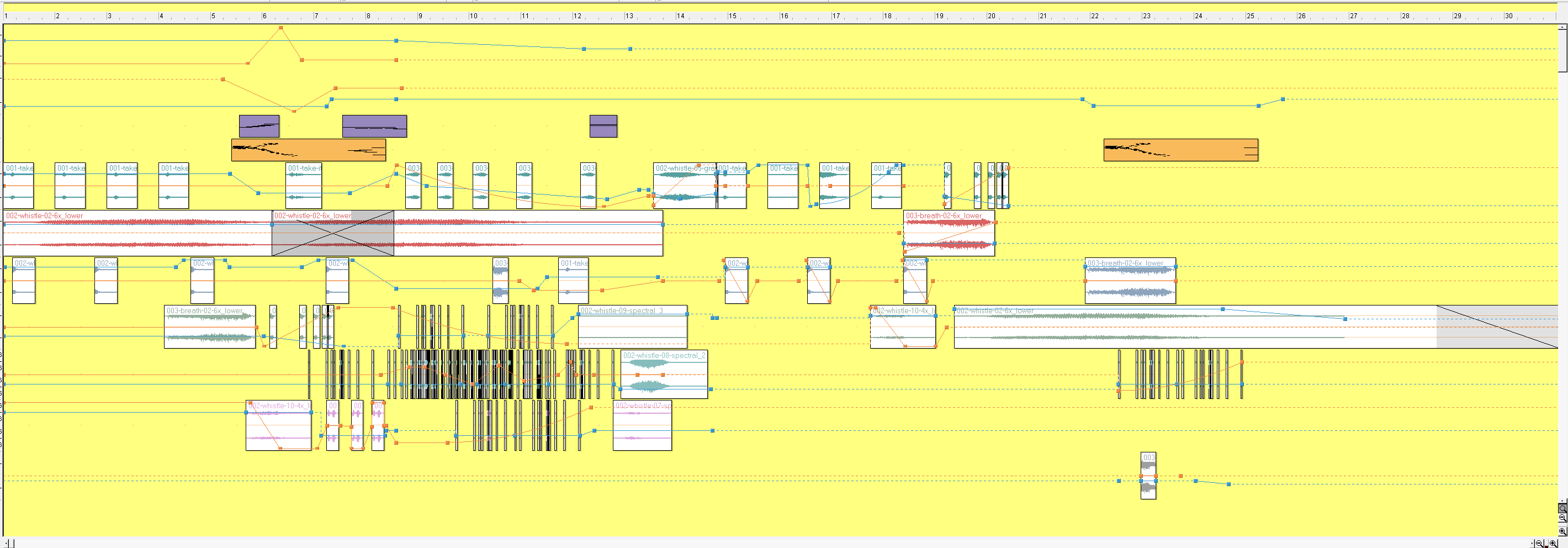 Below is a small clip of the assembly process (done in Sonar). One might think of it as orchestrating the electronic sounds, but in ways acoustic musicians can't achieve. The red lines are pan (left-right placement), the blue lines are volume. The sound cliips are shown as waves, and the purple and orange segments contain lines of Midi information. Instead of hundreds of little sounds being put in place one at a time, a set of acoustic samples was packed into a 'soundfont' and the Midi was used to play the individual sounds from the chromatic whistle and voice scales presented in the clips above. And last of all in this image, the overlapping gray area is a crossfade of two sound clips.