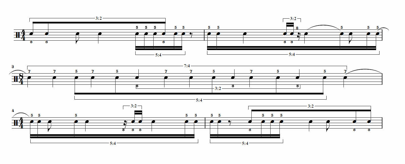 This method of pseudo-biological temporal modulation, similar to its use in fixed-media works and computer-assisted playback, is a significant concept in organizing rhythmic space. It requires a precision of playing that at the same time does not deny the expressive character of performance itself. It may breathe, but in present-day performance technique, it seems prone to failure.