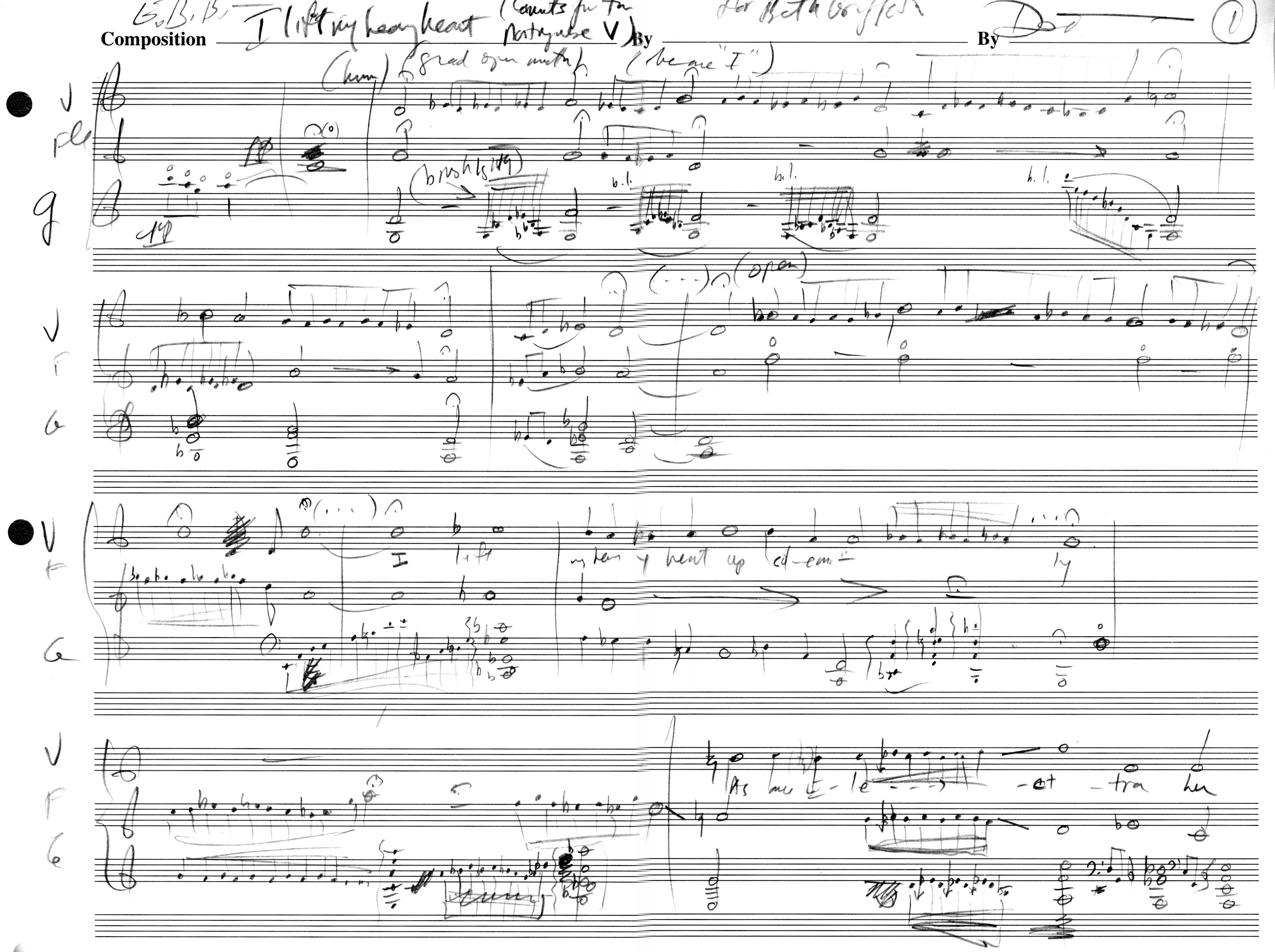 It's often been noted here that the process of composition is quickly forgotten, sometimes as it is still in progress. So it is with I lift my heavy heart. The score itself is revealing; though the original was given to Beth, a scan of the manuscript's pages (1 2 3 4 5) and a comparison with the engraved score in progress reveal how my hand works.