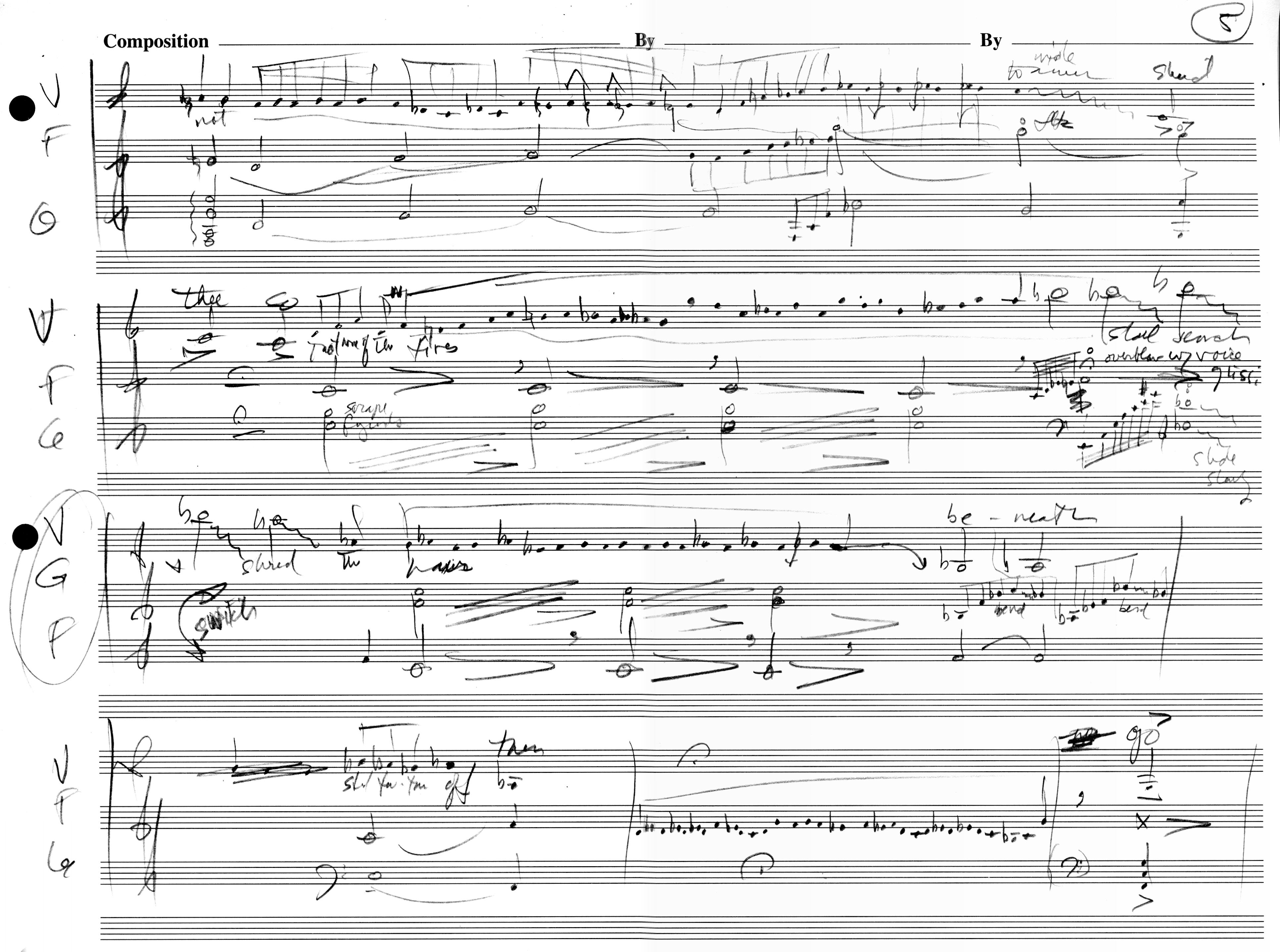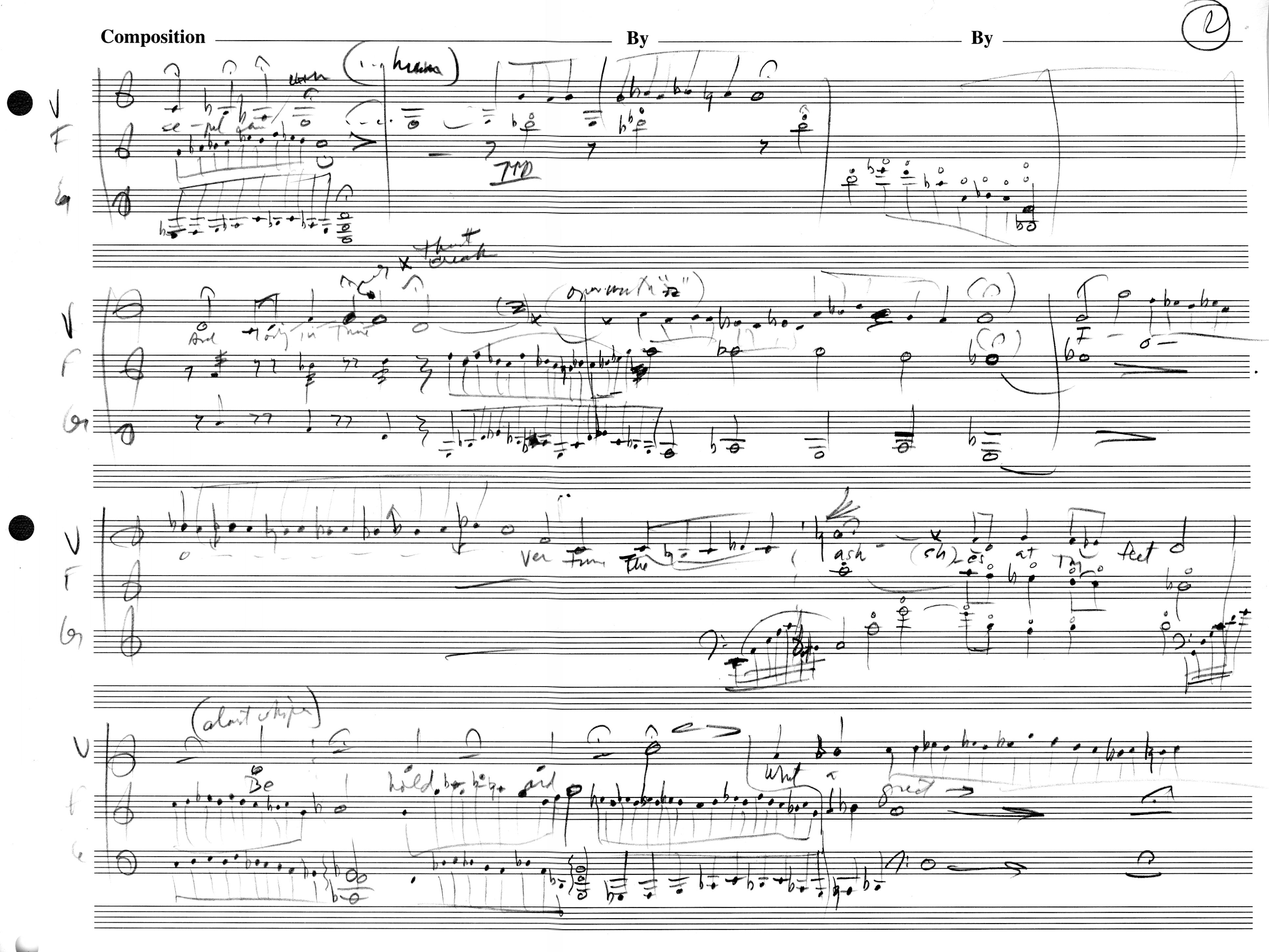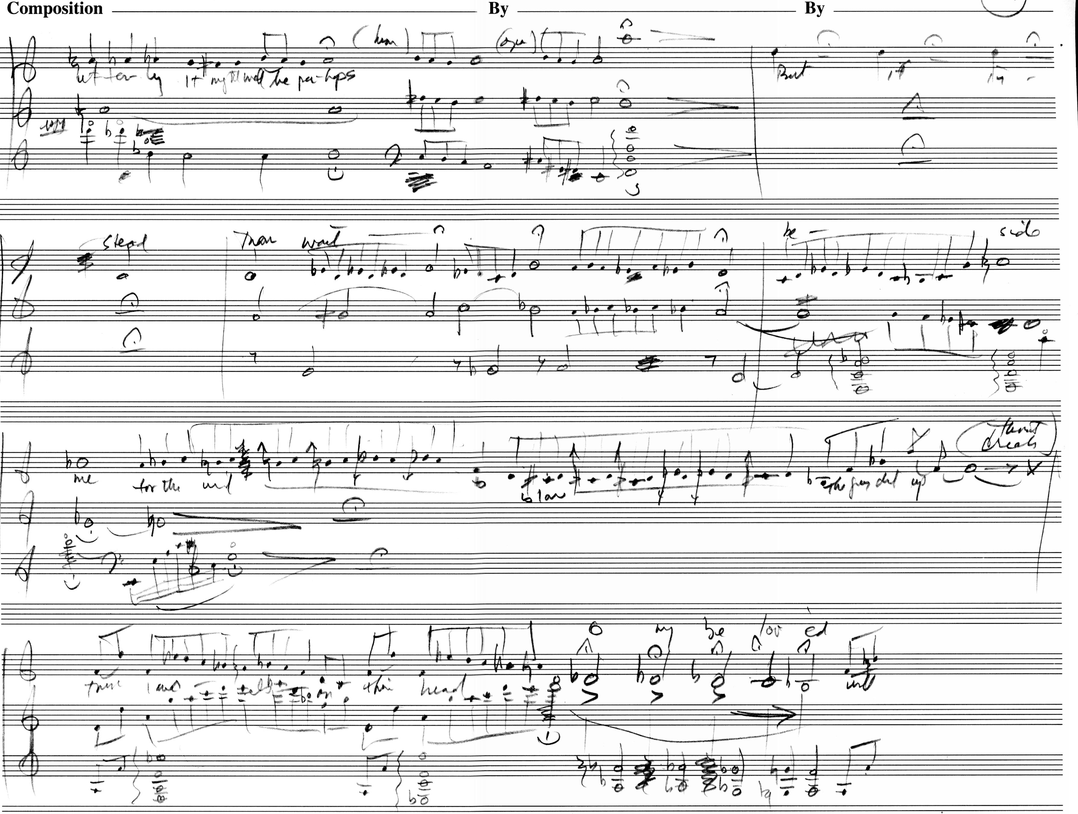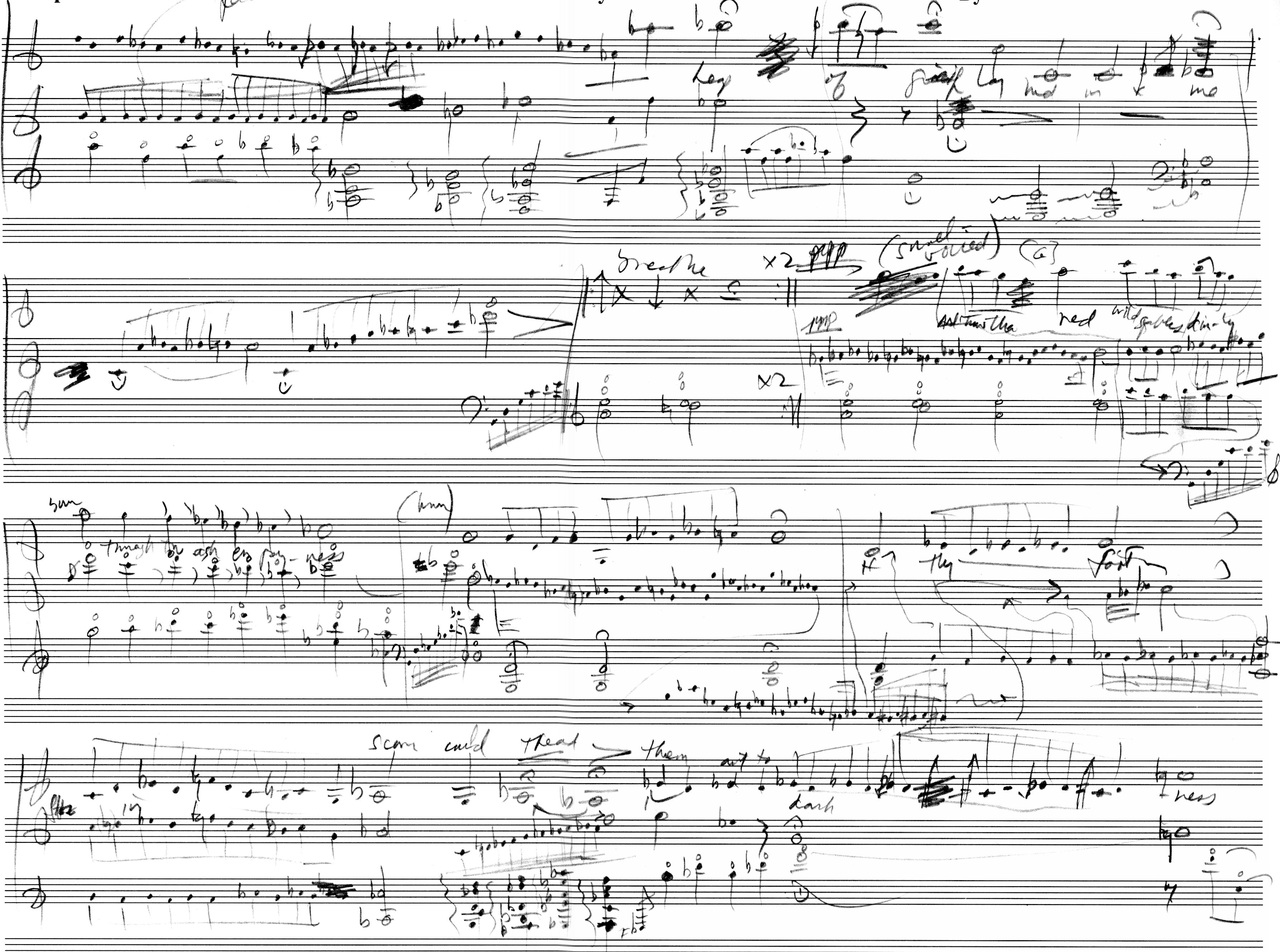 The notation is idiomatic and idiosyncratic. Notes are grouped as needed. Barlines are for placekeeping, not timekeeping. The intimacy of a small ensemble and vocal cues dismiss the need for the formal structural elements of earlier music. Instructions of what to do and when to do it are given to encourage fluidity. Despite the notation, this is not an avant-garde composition; it is in the tradition of Browning, and the music is driven by the words. The result in Beth's hands will be thrilling.